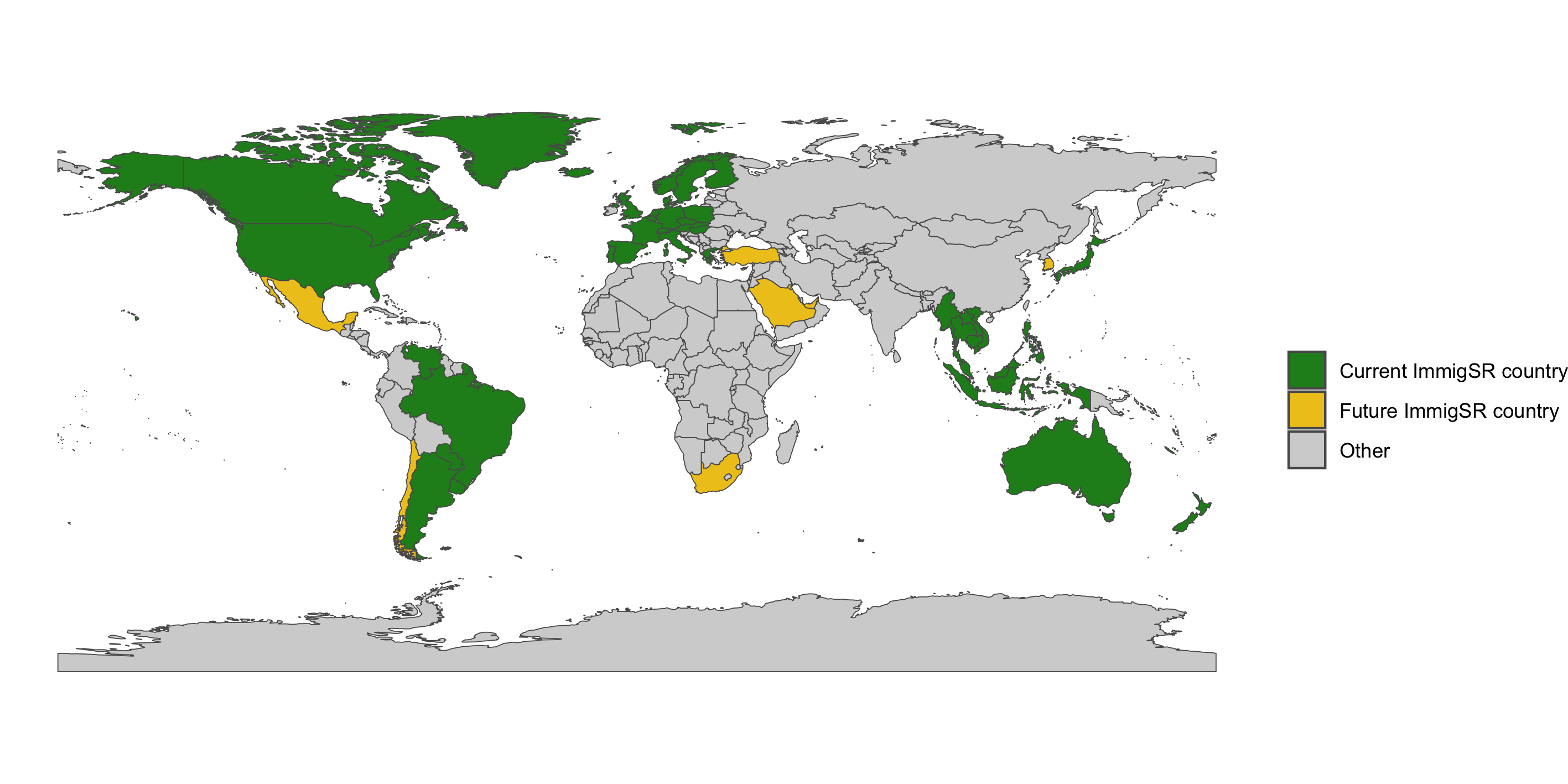 The second wave includes all countries from the first wave, and adds data for the years 2019-2021. Furthermore, eight additional countries were added for the years 2000-2021 (marked yellow). These are: Chile, Kuweit, Mexico, Turkey, Saudi Arabia, South Africa, South Korea and the United Arab Emirates.